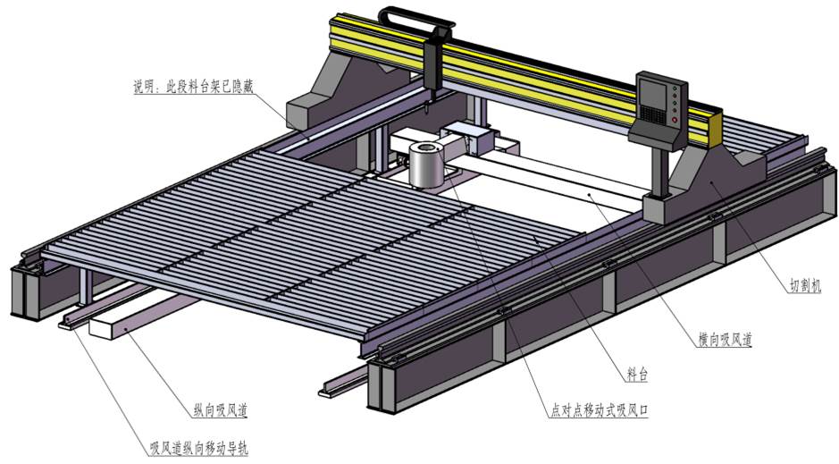 側吸式煙塵凈化系統(tǒng)采用吸風口固定在切割機龍門架上,吸風口與吸風道之間通過密封皮帶密封,吸風口可隨龍門架在吸風道上來回移動吸風,將切割的粉塵吸除。